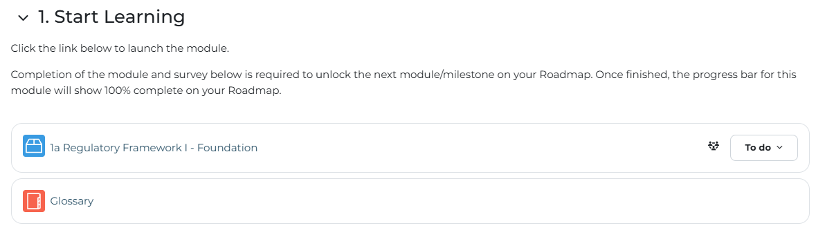 Learning modules save your location upon logout and can be resumed next time you start them. Login to the LMS. Access your roadmap. Open the learning module (e.g. 1a Regulatory Framework). The learning module will open in a new window. The system ...